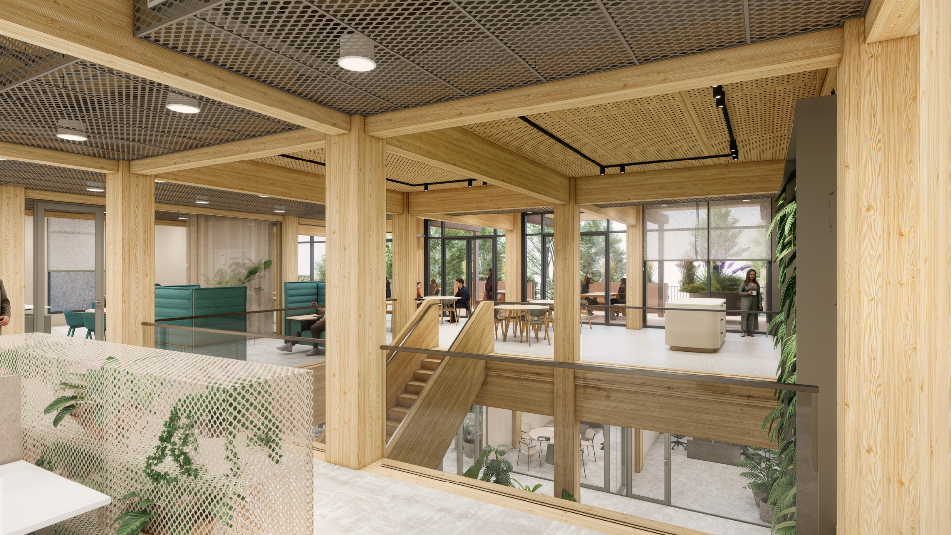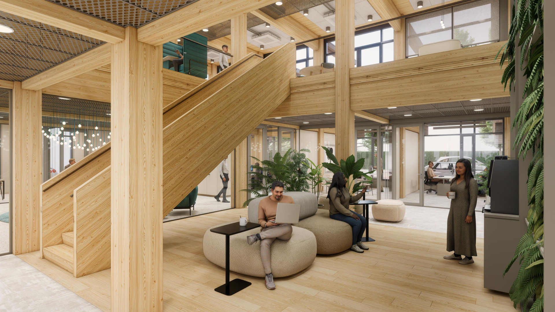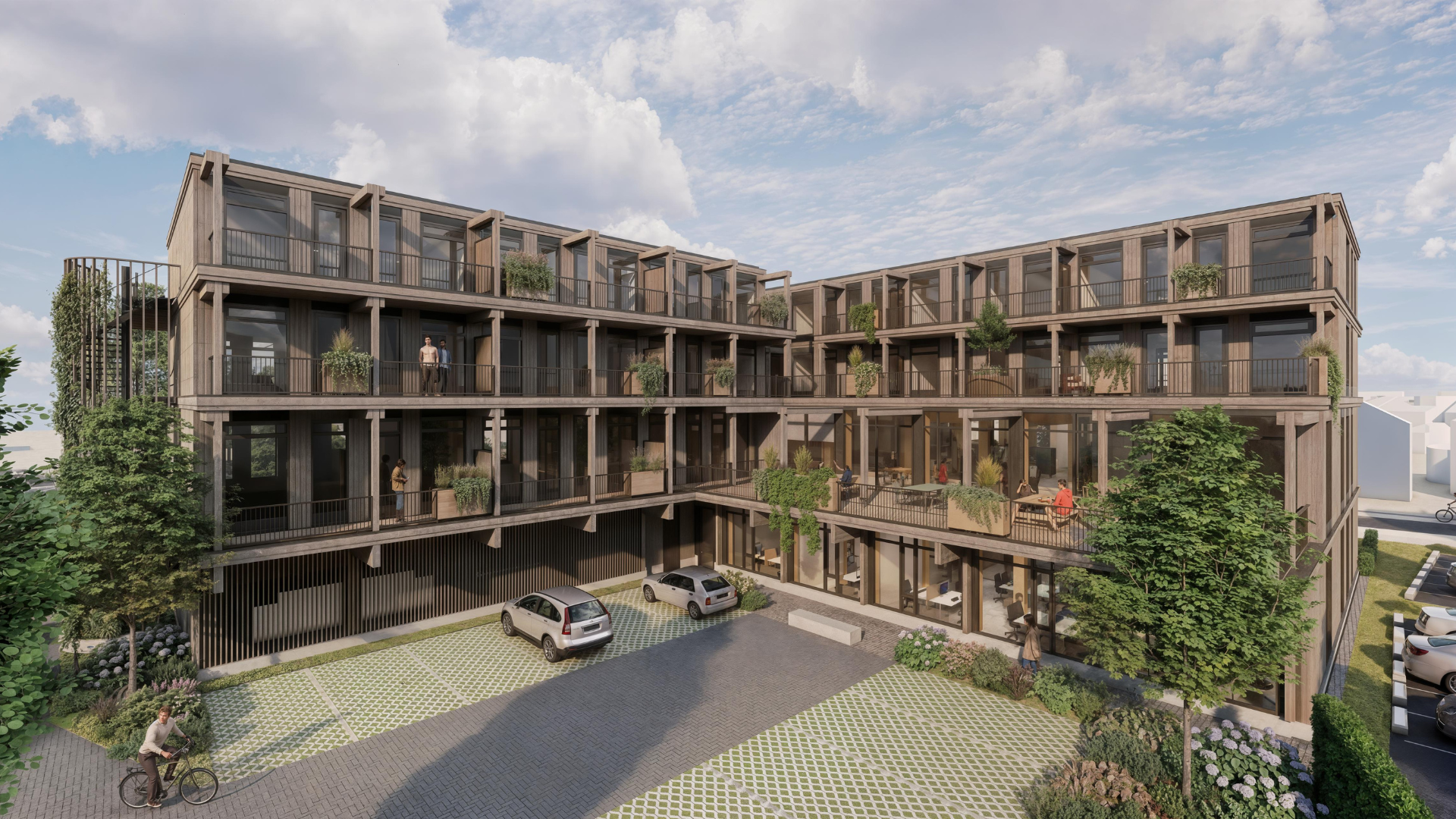 Een bijzonder aspect van dit project is de keuze voor volledige houtbouw. In lijn met de duurzame ambities van Woningbelang wordt het gebouw gerealiseerd met een houten draagconstructie. Het kantoorgedeelte krijgt een kolom-liggerstructuur van gelamineerd hout, terwijl de appartementen worden uitgevoerd in CLT elementen (kruislaaghout).